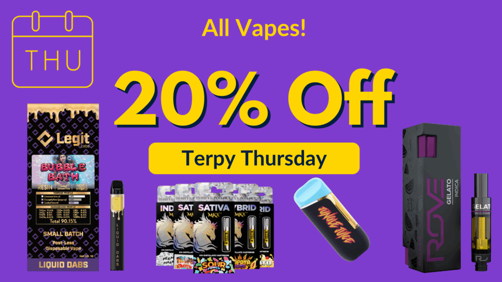 Discounts*: Senior (65 and over), Veteran and Medical Card Holders – 20% | Student (with i.d.) – 30% off until end of semester | First time – 40% Off| Birthday – Pre Roll | Service Industry and 1st Responders 20% Off on Mondays and Tuesdays | Cannabis Industry Employee- 15% |